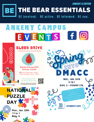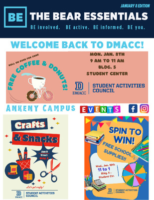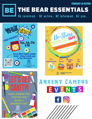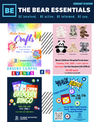 "Staff in Student Activities started 'The Bear Essentials' when DMACC went virtual during the Covid-19 pandemic. We wanted a way to keep the students connected and engaged with us, wanted to provide study tips, how to stay organized, how to stay connected with DMACC resources, and how to stay active and involved with some fun events being produced by DMACC Campus Rec, DMACC Student Activities, and other clubs and departments. We wanted students to know they were not alone, the entire DMACC Community was coming together to help support one another in any way possible." ~Erin Smith, Coordinator of Student Activities, May 12, 2020