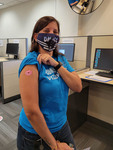 A DMACC employee shows off her COVID-19 vaccine sticker.